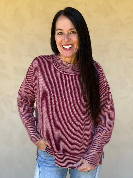 Zenana Acid Washed Side Slit Sweater, Cabernet