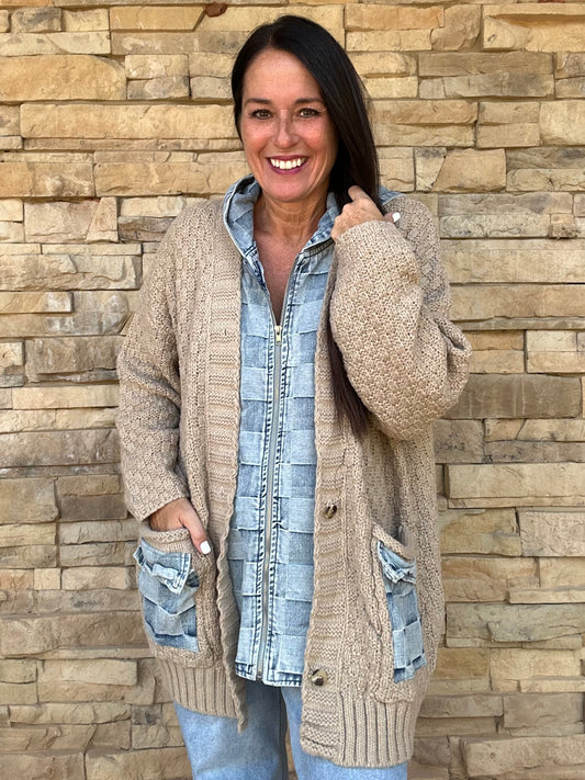 Checker Denim Zip Up Sweater Cardigan, Latte