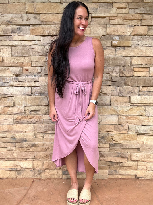 Zenana Sleeveless Belted Tulip Dress, Rose