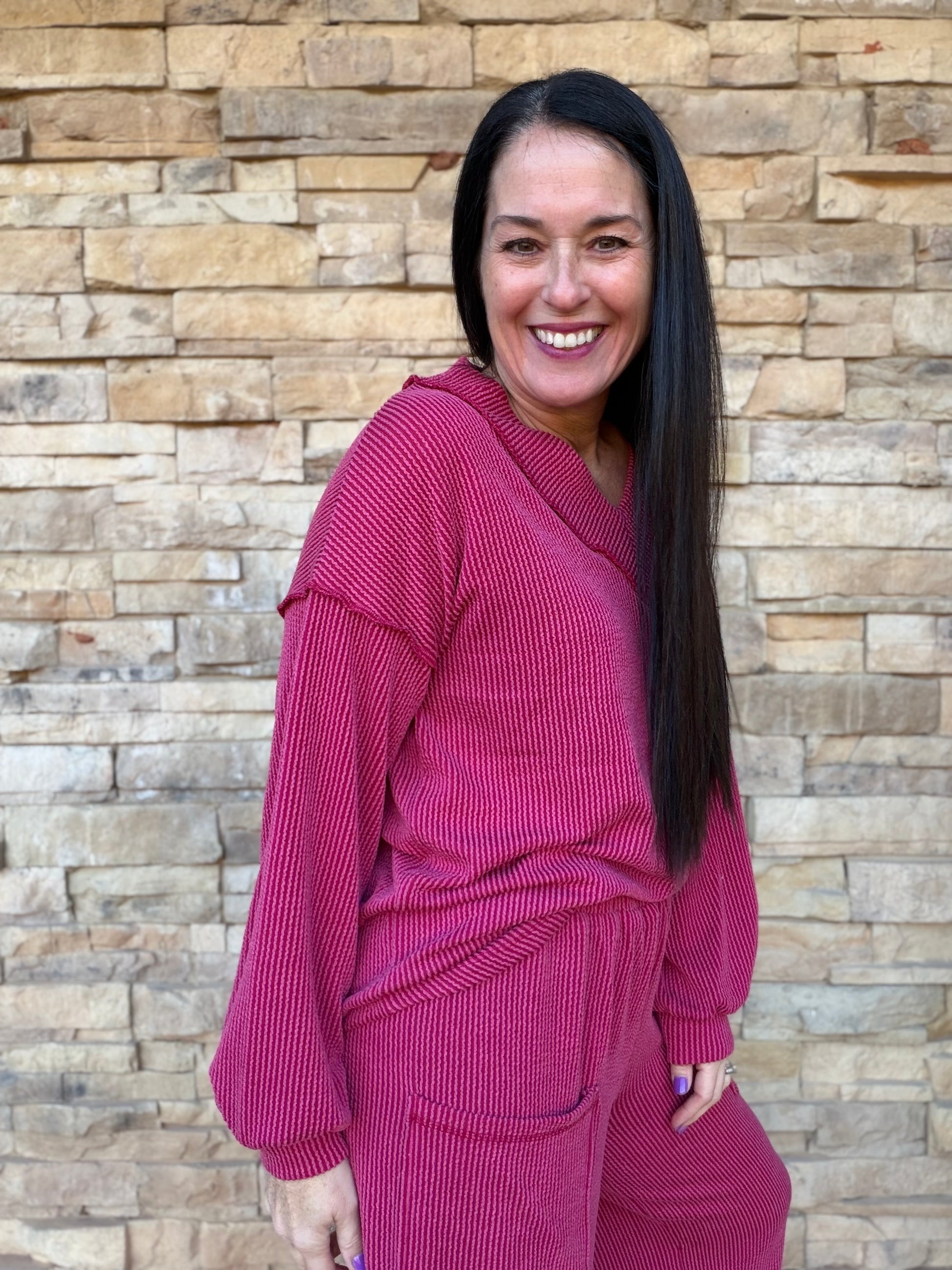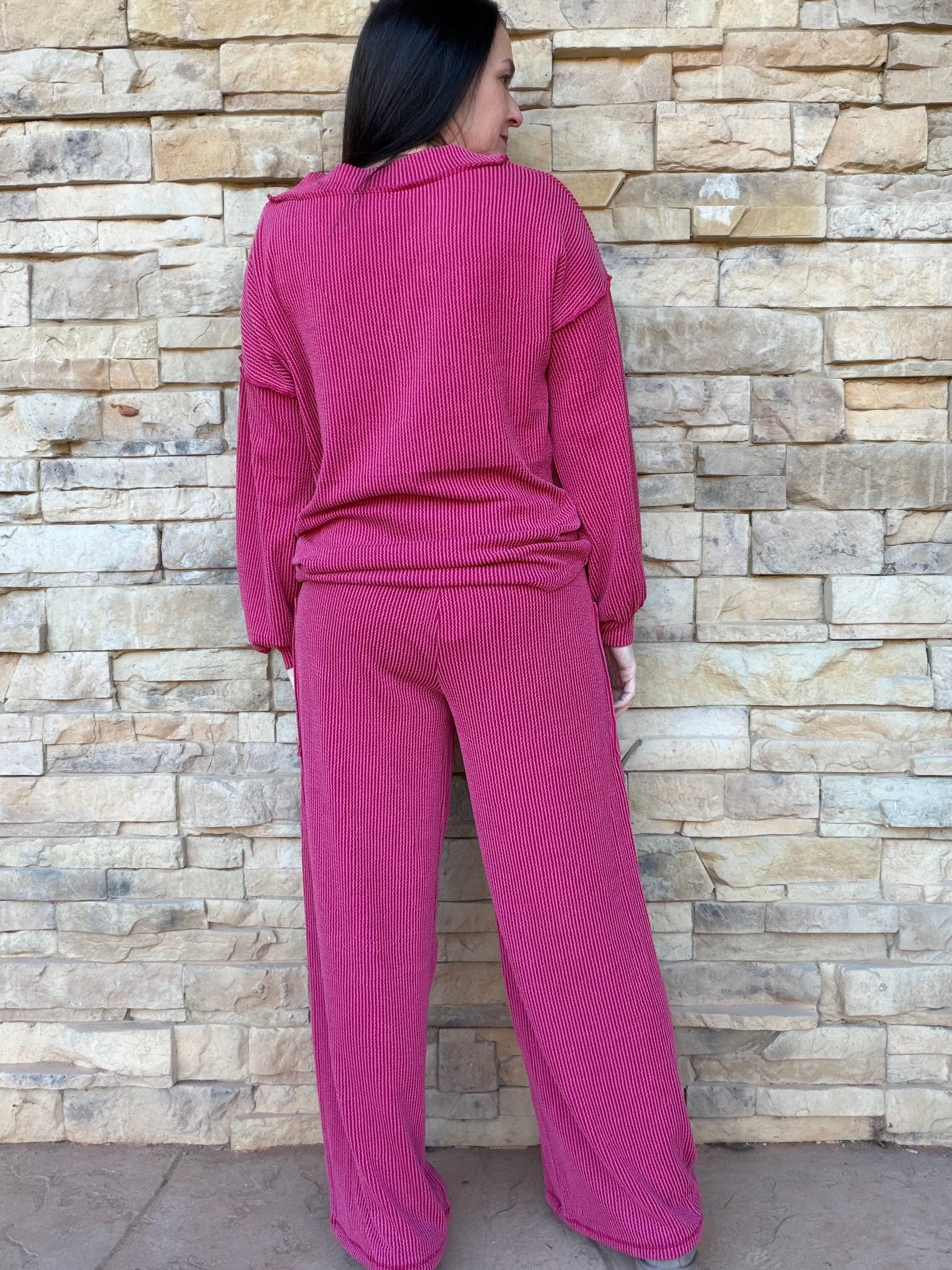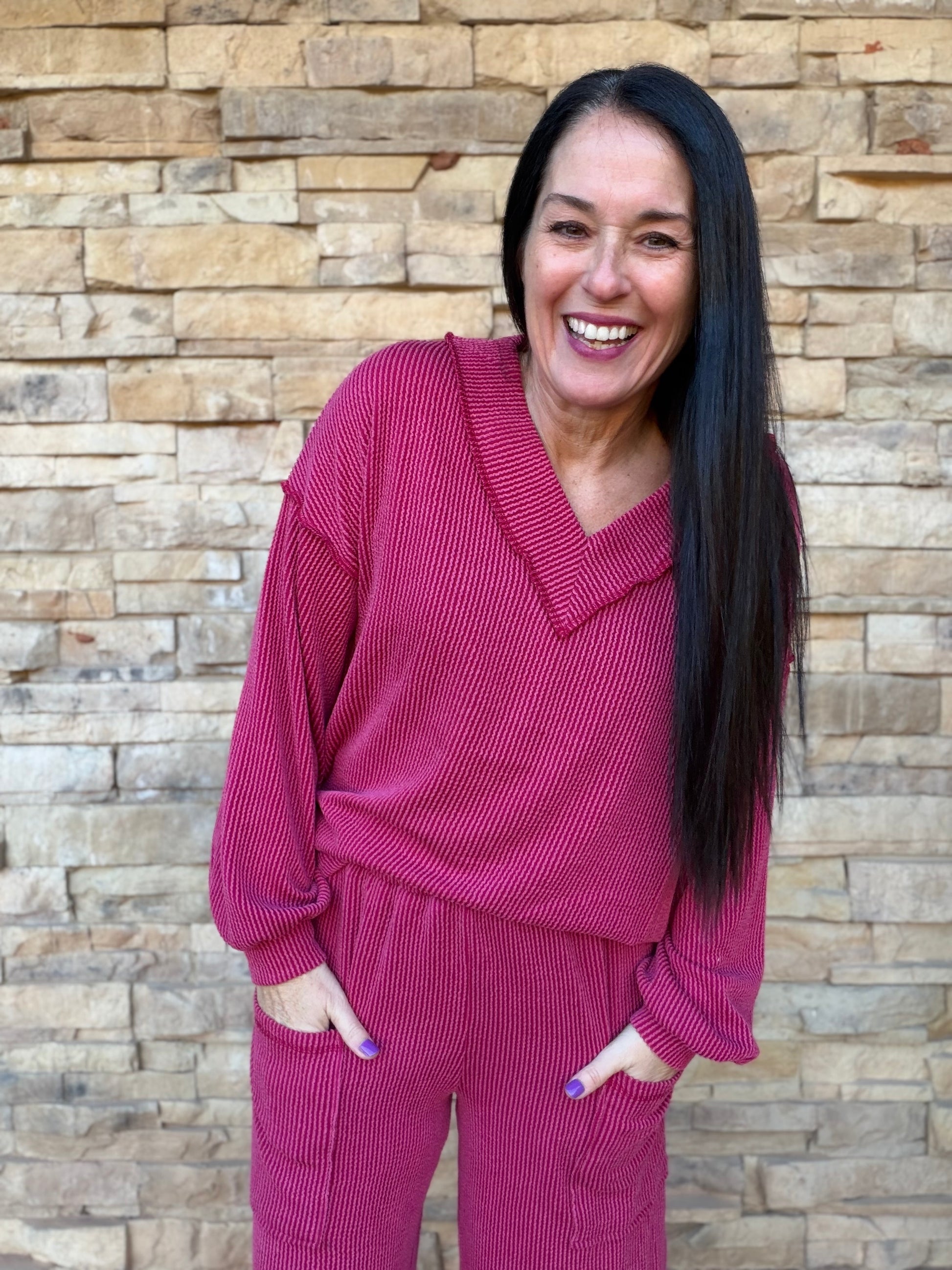 This cozy new set features a stretchy burgundy ribbed fabric, V-neckline top, contrast stitching, elastic pant waistline, and side pockets!
