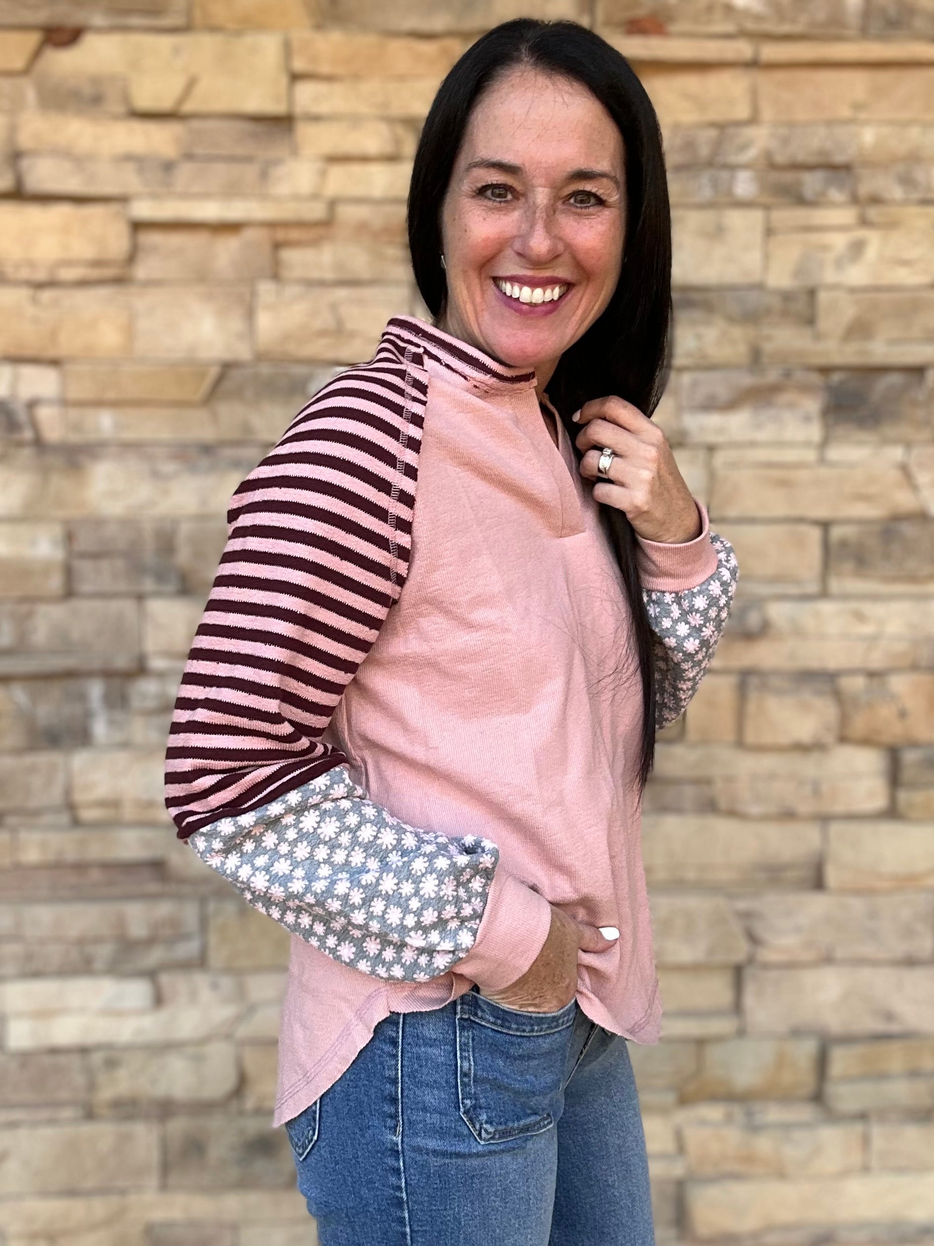 This cute new top in blush pink features a V-neckline, rounded hemline, and contrast stripe and floral sleeves.