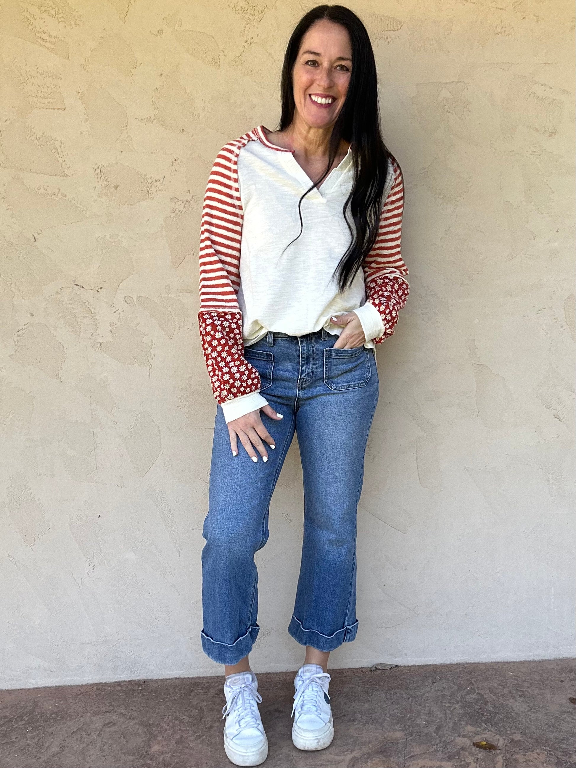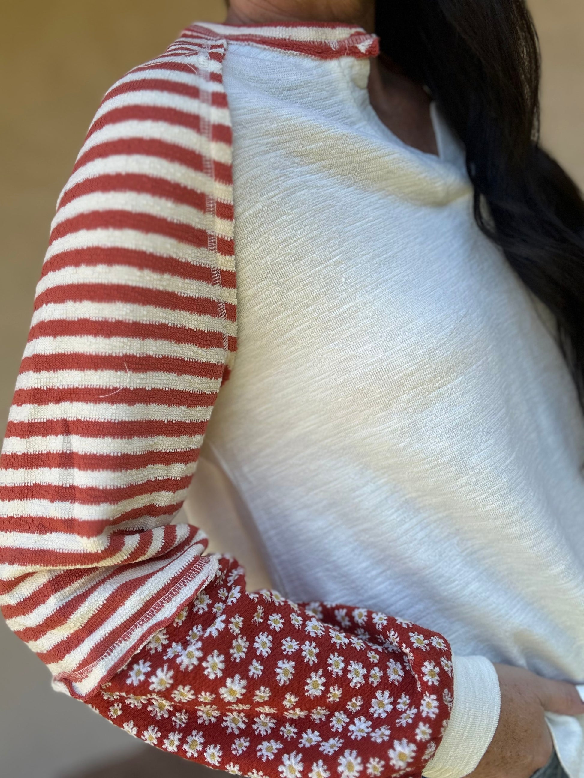 This cute new top in cream and red features a V-neckline, rounded hemline, and contrast stripe and floral sleeves.