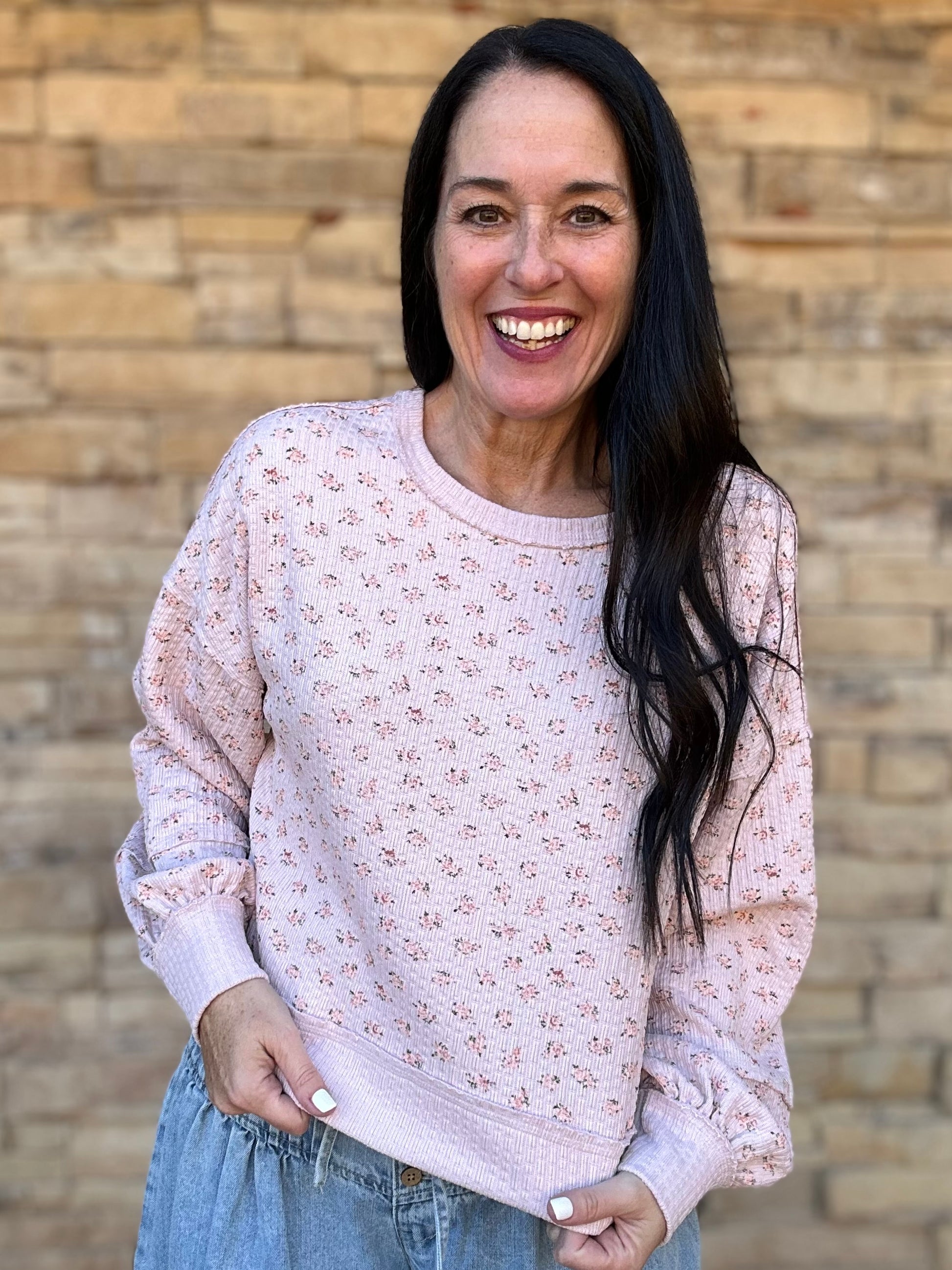 This cute new top in blush pink features a dainty floral print, a cropped length, and a cute neckline detail on the back.