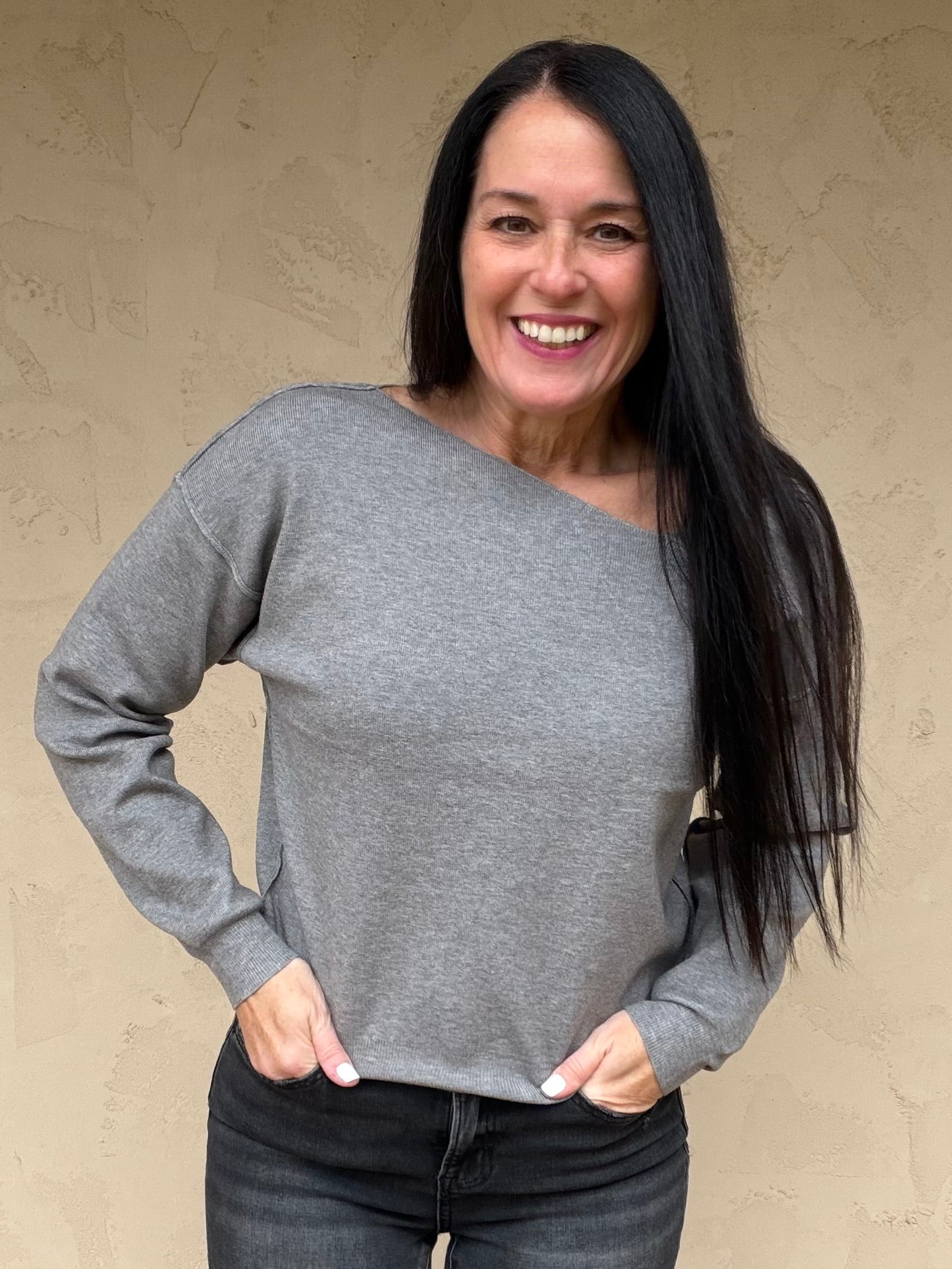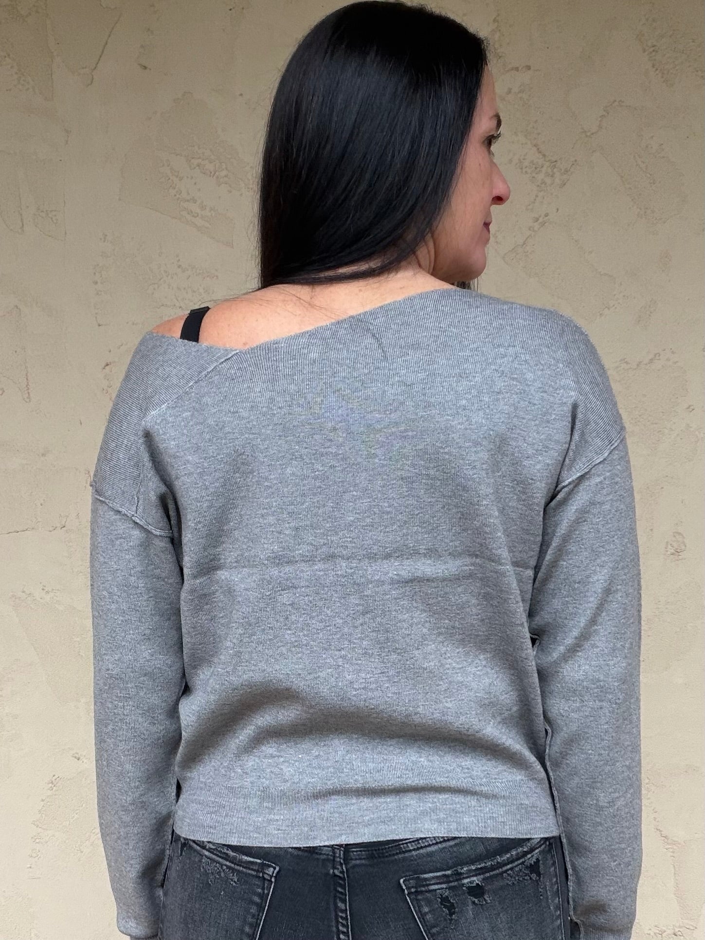 This gorgeous new sweater features a soft solid grey fabric, asymmetrical neckline, and slightly cropped length.