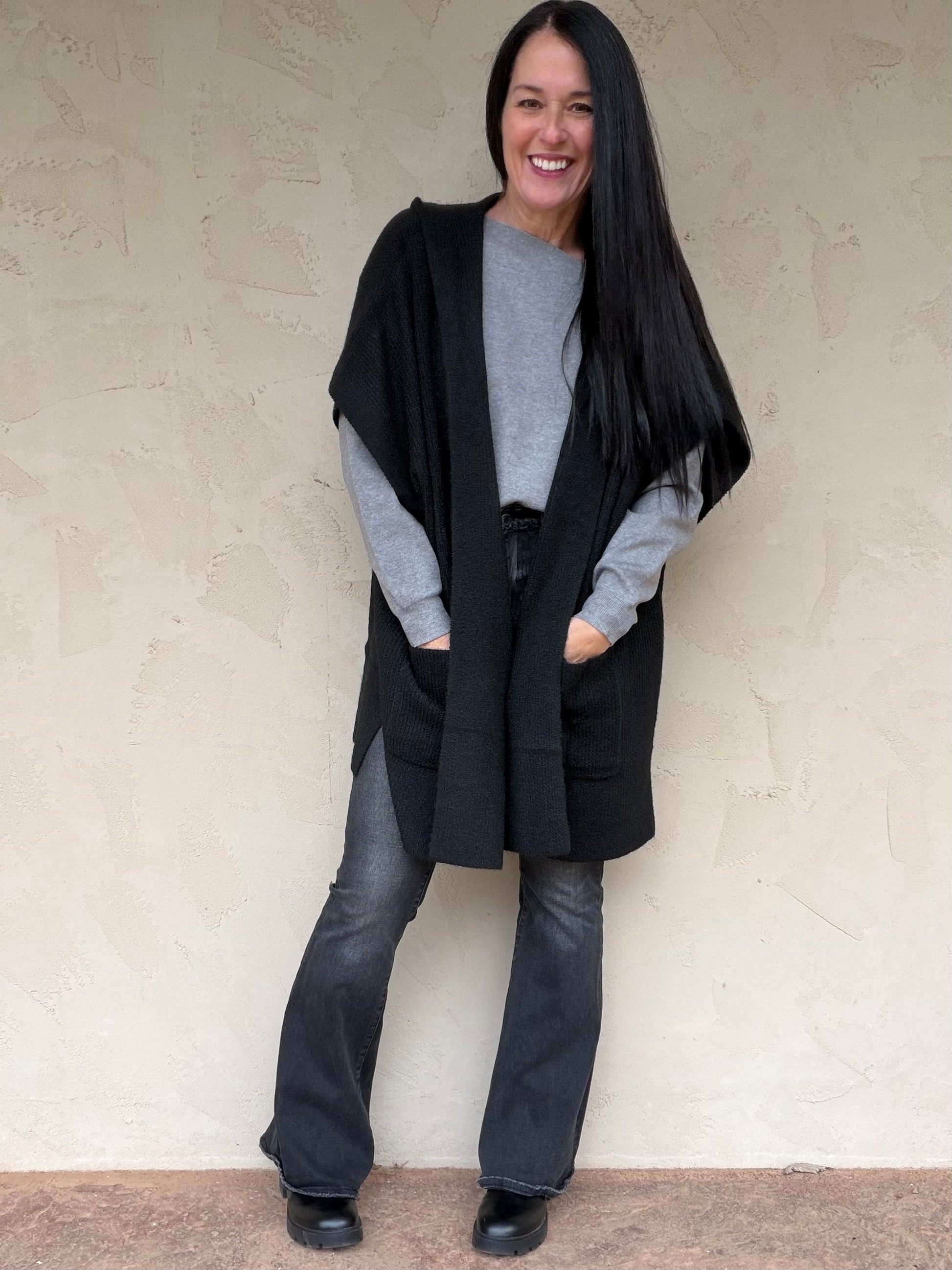 This super cute new cardigan poncho features a soft and fuzzy black fabric, long side slits, wide arm holes, and hood!