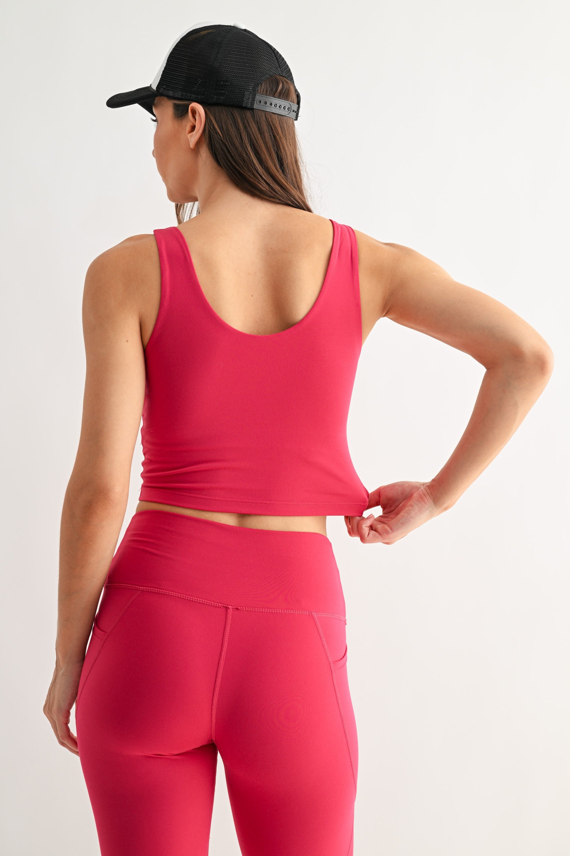 Designed with a built-in bra for effortless support, this buttery soft tank offers a longer cropped length that pairs perfectly with your favorite leggings or high-waisted bottoms. Its stretchy, comfortable fabric lets you move with ease, whether you're at the gym or on the go.