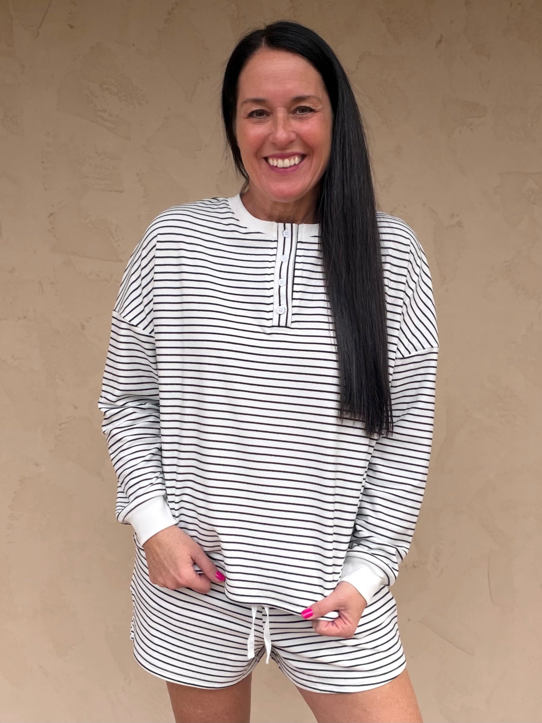 This adorable, super soft two piece set features an ivory base with black pinstripes, long-sleeve top with a relaxed fit with a chic split neckline and cozy cuffed sleeves, and high-waisted shorts with an elastic waistband and adjustable ivory drawstring.