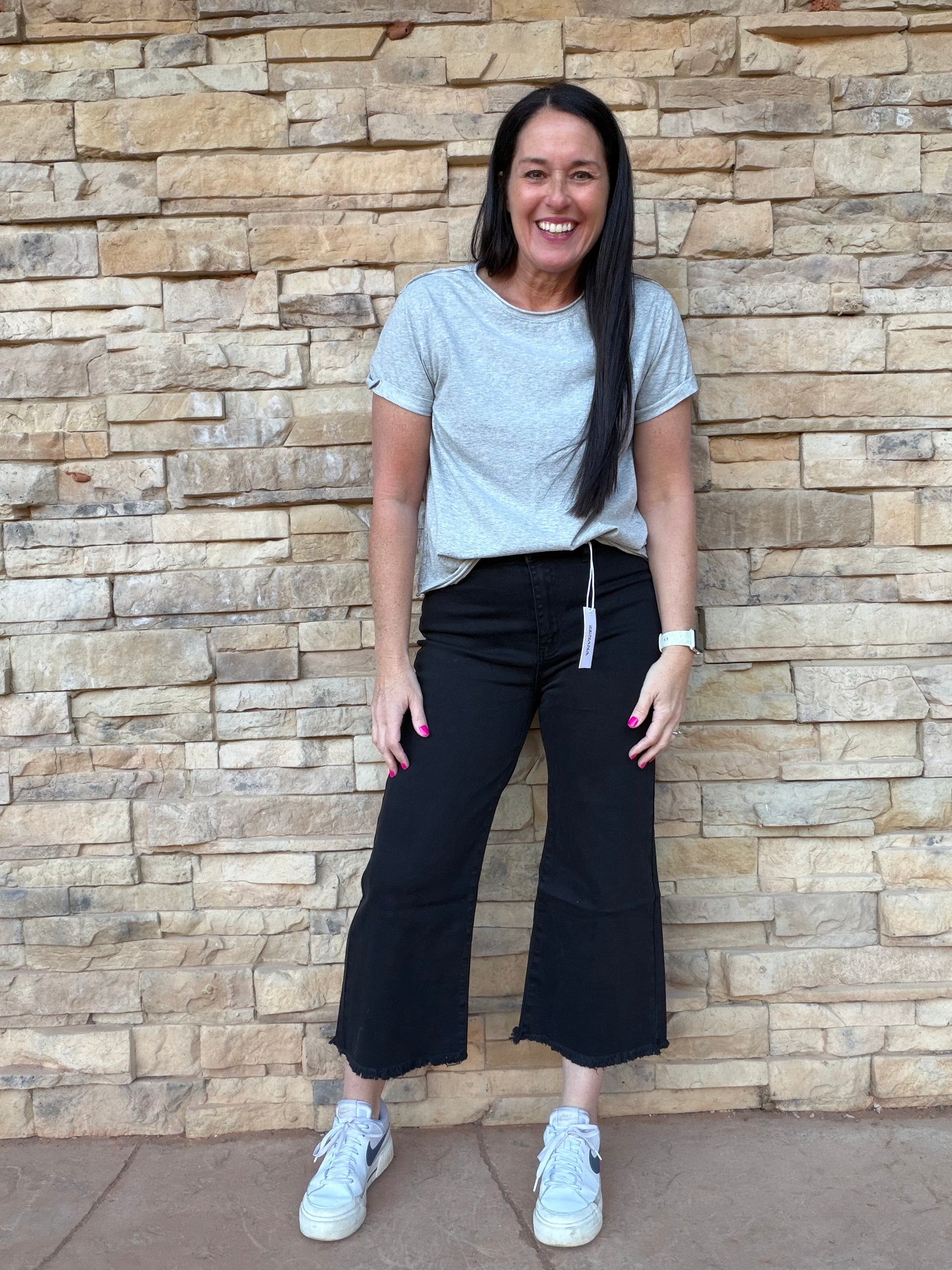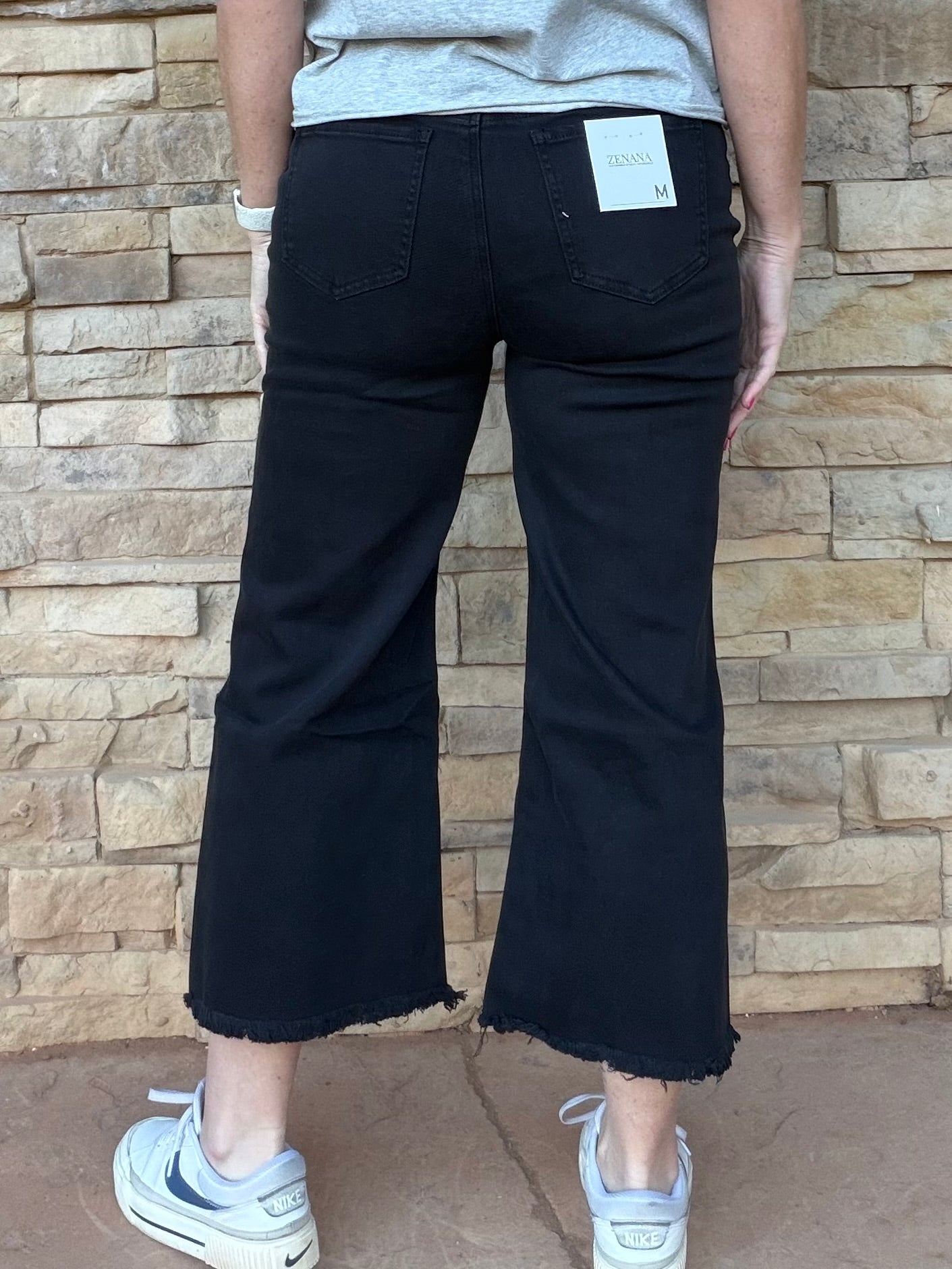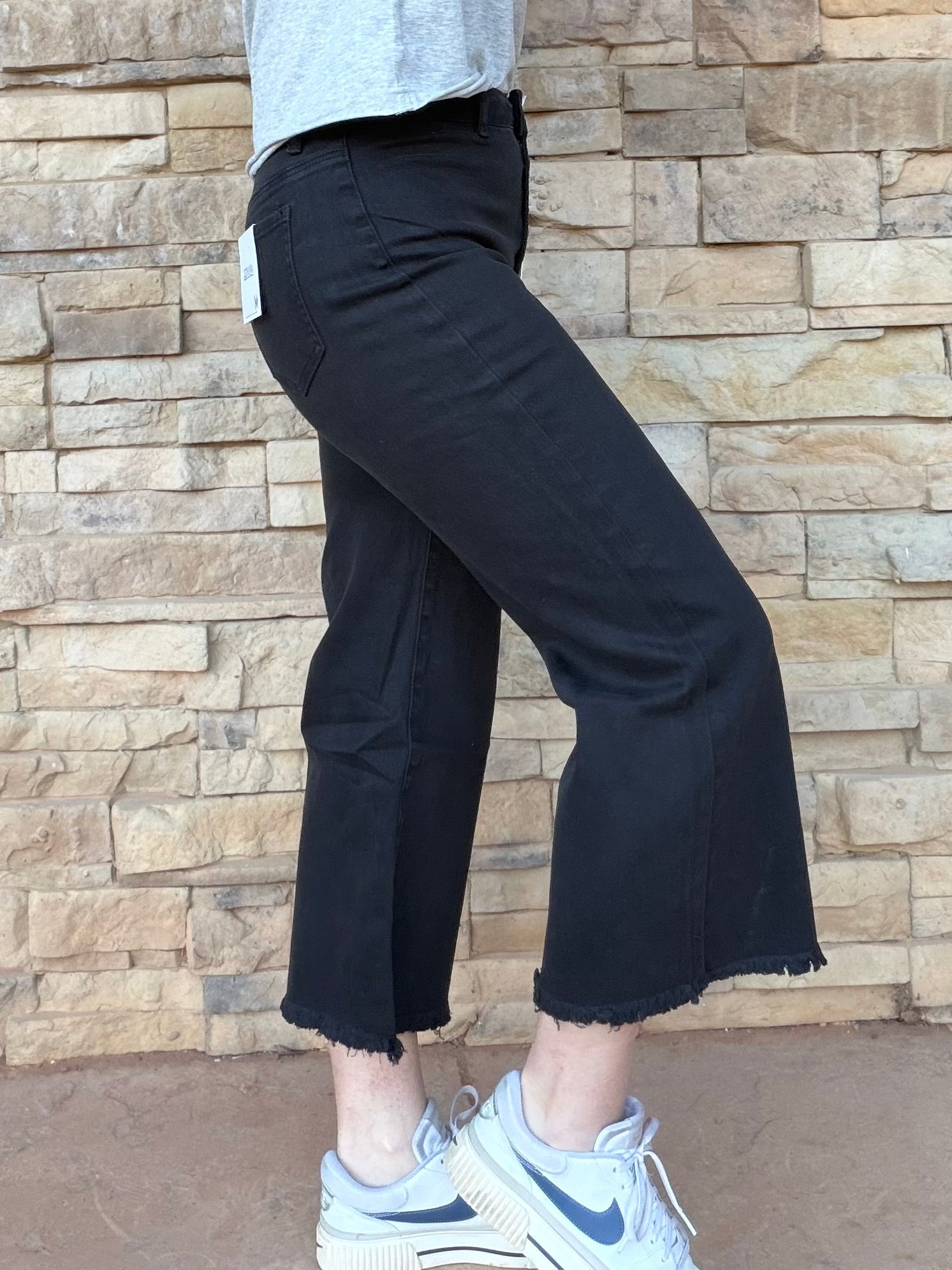 Our new Zenana cropped jeans feature a soft and stretchy solid black denim fabric, and wide leg frayed hemline.