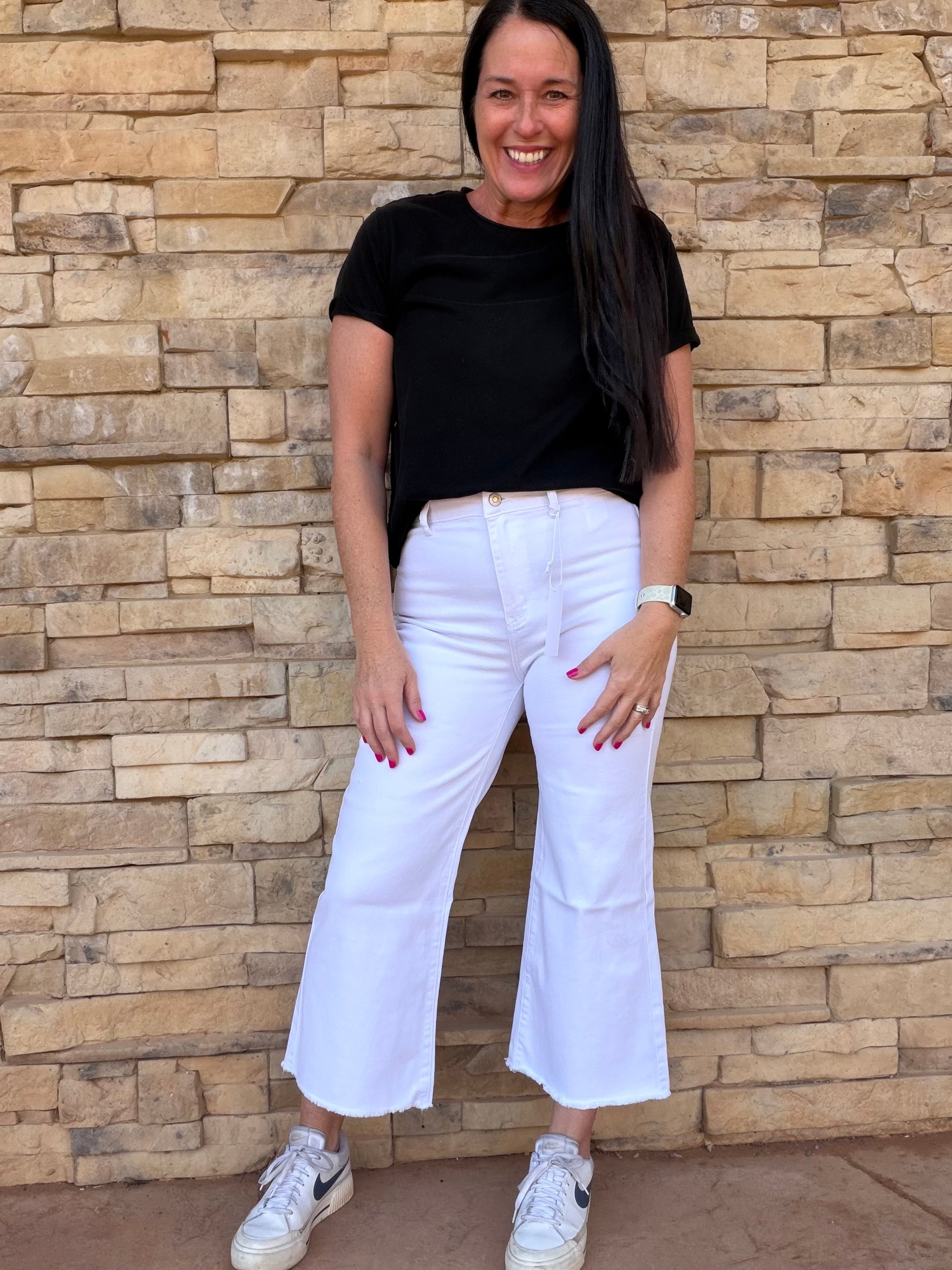 Our new Zenana cropped jeans feature a soft and stretchy solid white denim fabric, and wide leg frayed hemline.