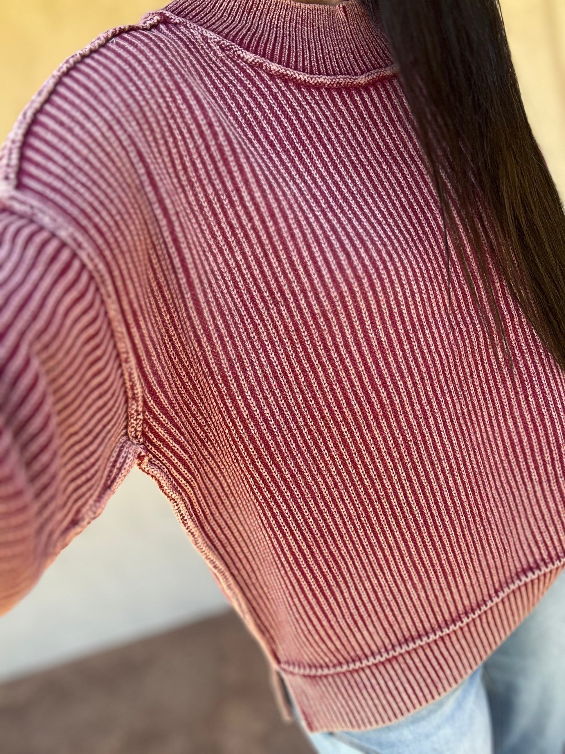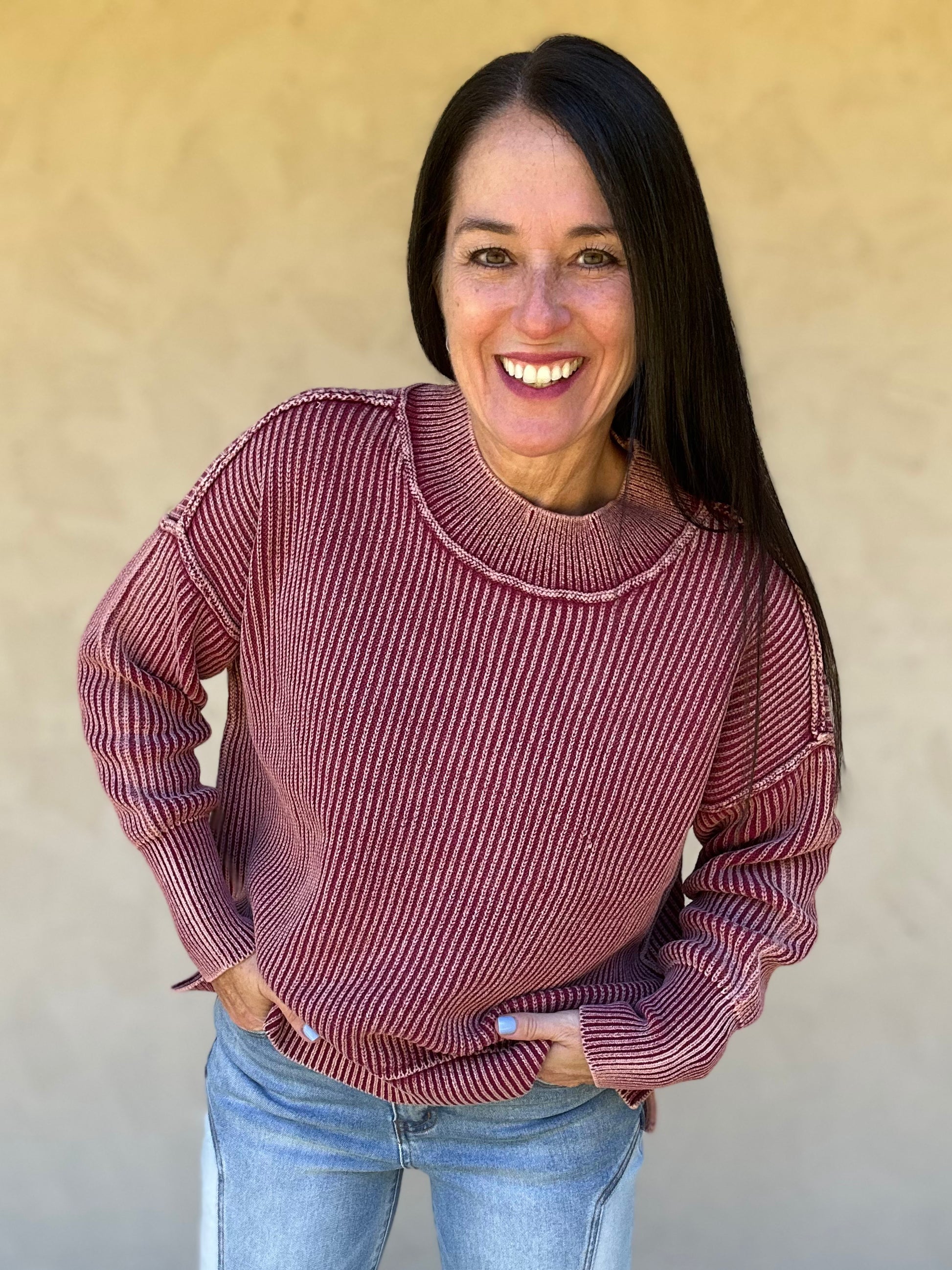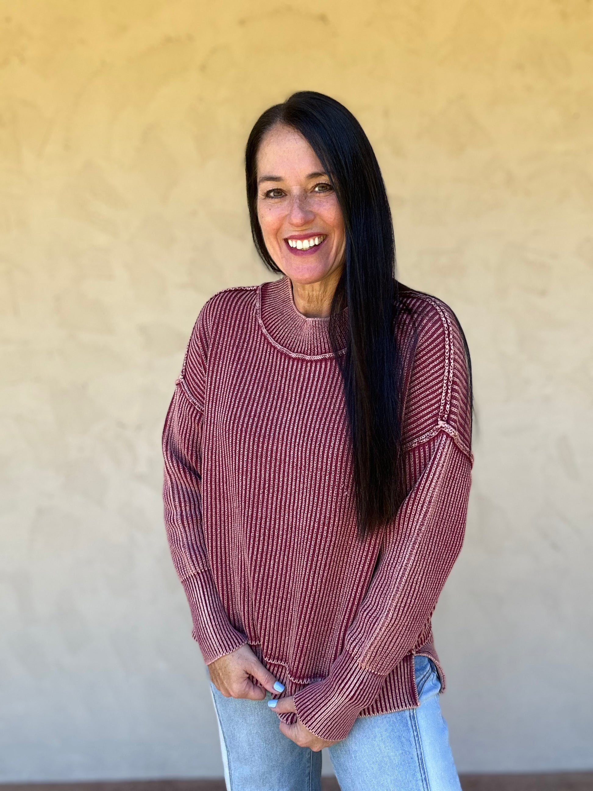 This gorgeous sweater features a cabernet red acid washed fabric and small side slit detail.